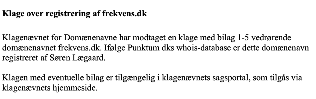De havde modtaget en klage vedrørende domænenavnet Frekvens.dk.