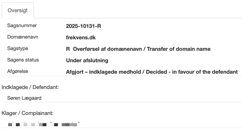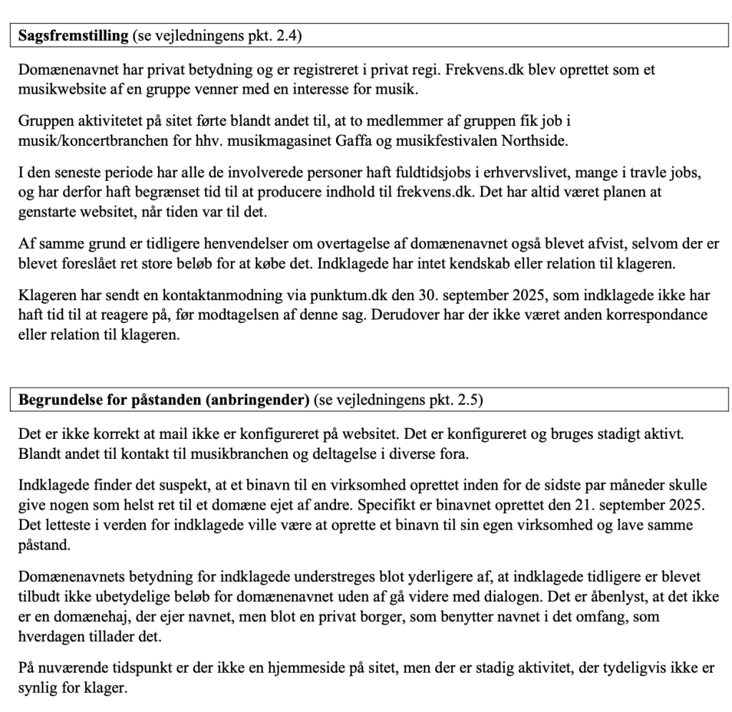 Personen havde endda oprettet et binavn under sin virksomhed kaldet Frekvens, og han mente derfor, at det var bedre, at han havde domænet end mig. Jeg var derfor blevet indklaget for domæneklagenævnet.